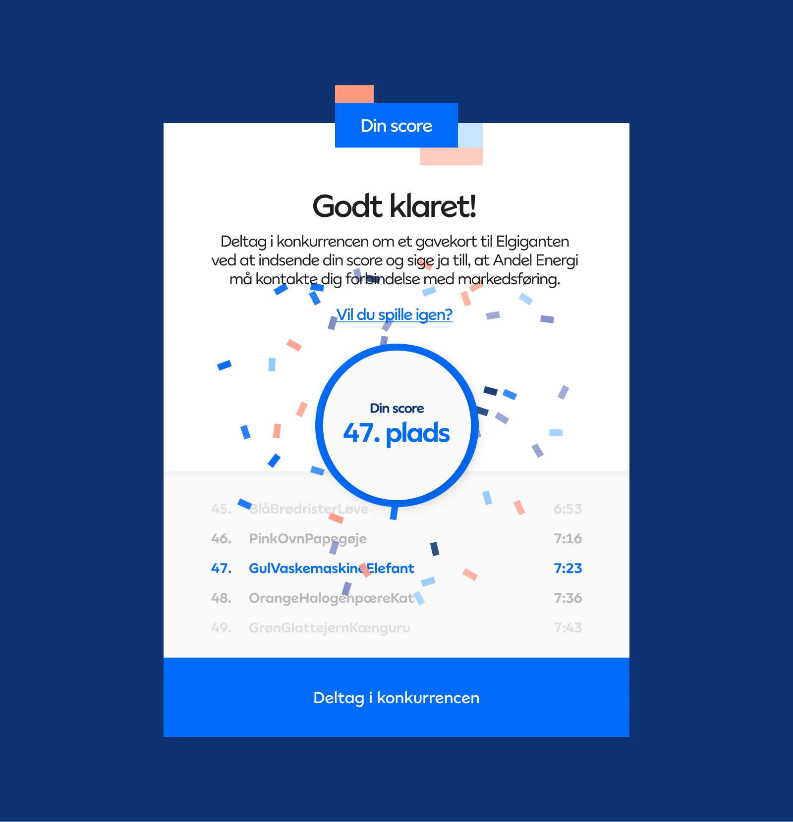 From December 5th to the end of the Christmas month, over 100,000 people have tried the game and the players who dominate the high score list have played between 80 and 130 times each. The accompanying email campaign had a click-through rate (CTR) of 31.1%, and over 18,850 people participated in the associated competition and gave full permission or upgraded their existing permission to Andel Energi.