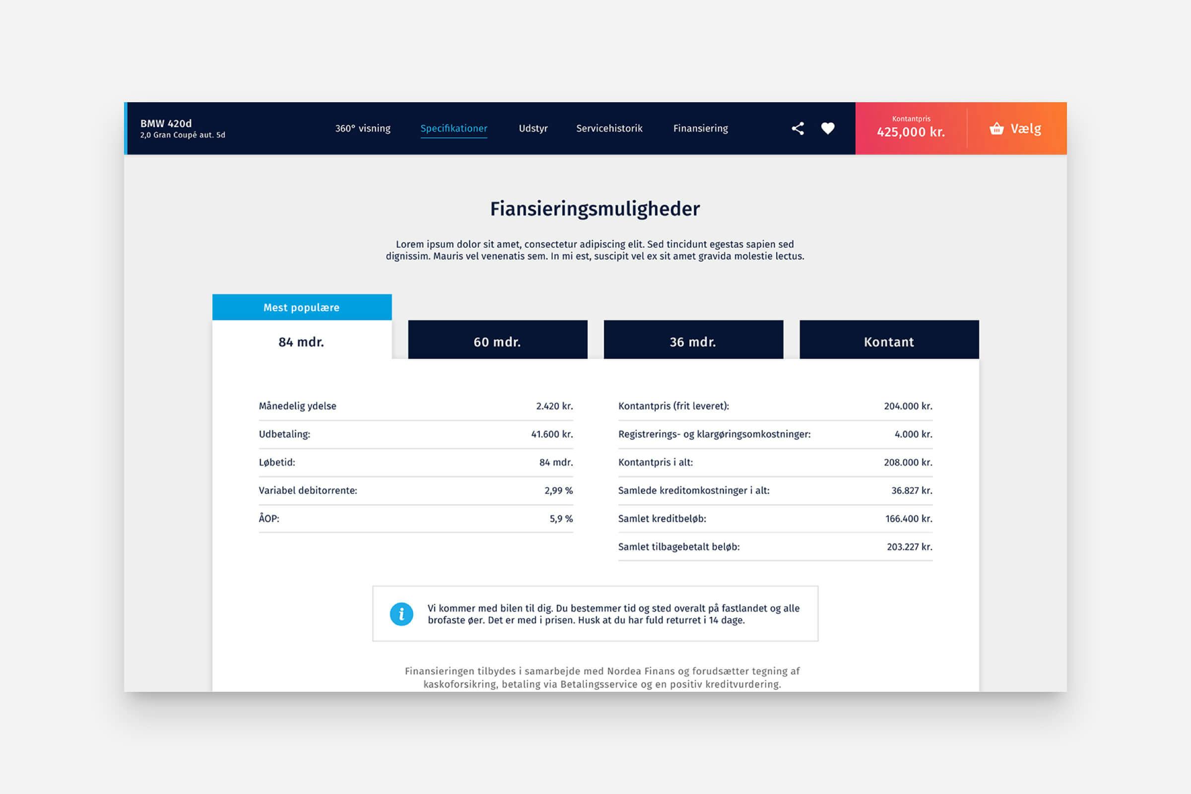 Gratis levering til hoveddøren, 100 km prøvetur, 14 dages fri returret, 360 graders billeder inde og ude, komplet servicehistorik og dokumentation af hver en skramme. Det er kernen, i det koncept vi har udviklet sammen med ALD til onlinesalg af velholdte brugte leasingbiler. Det er ”en bruger- og serviceoplevelse med en kurv”. Noget af det vi er bedst til.