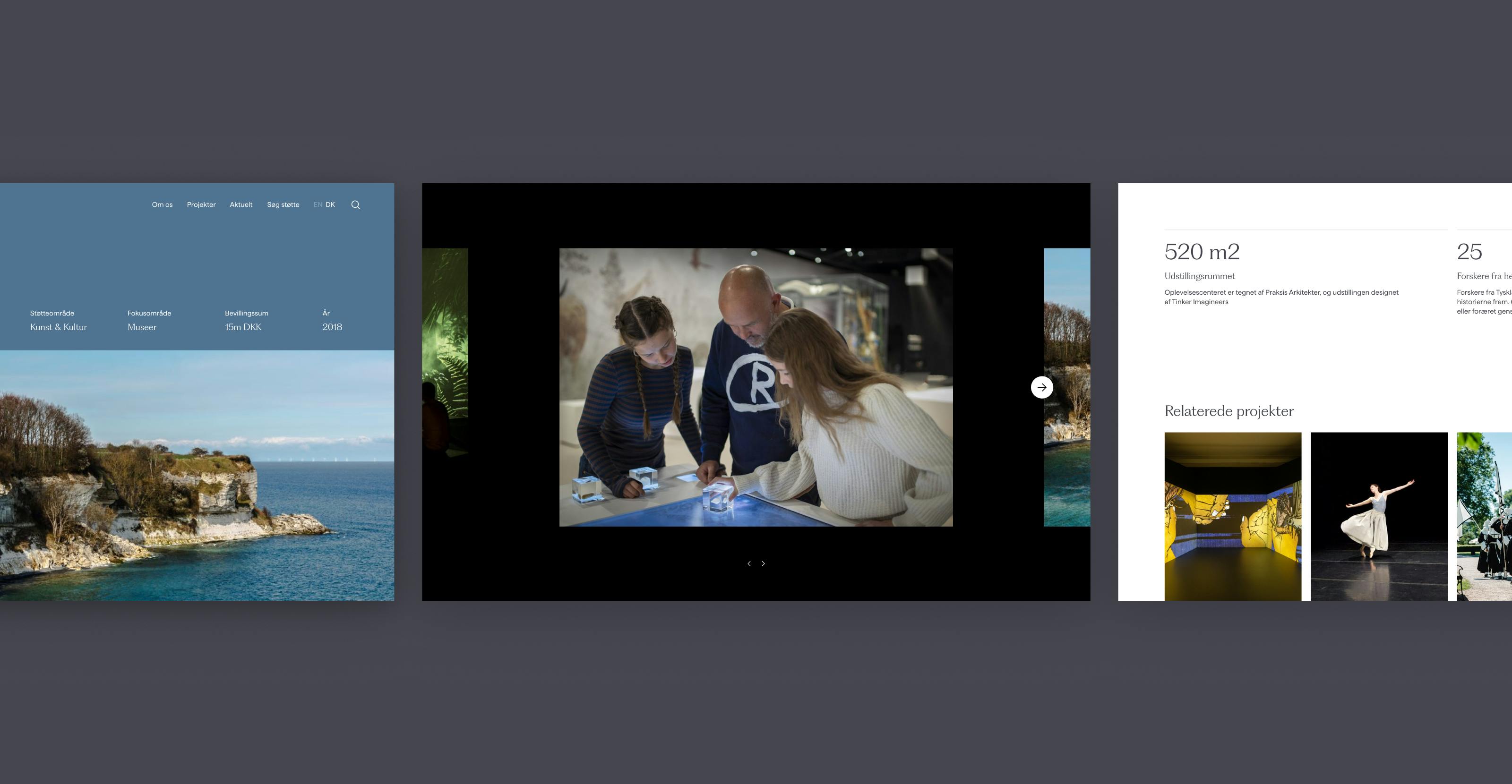 Designkonceptet tager inspiration fra fondens eksisterende designprofil med et rigt visuelt materiale og brug af farver, som er omsat til ideen om en ‘kamæleon’, som bruger dens evne til at skifte farve som et kommunikationsgreb. Med det in mente, har vi skabt et adaptivt farvesystem, som skifter farve efter hvilket billede, der bliver præsenteret på den pågældende side. Farvesystemet tillader fonden at kommunikere på to måder - afdæmpet og subtilt, når der kommunikeres om fonden selv, og mere farverigt og larmende, når der kommunikeres om de projekter, som fonden støtter. Det dynamiske farvesystem understøttes af CMS’et.
