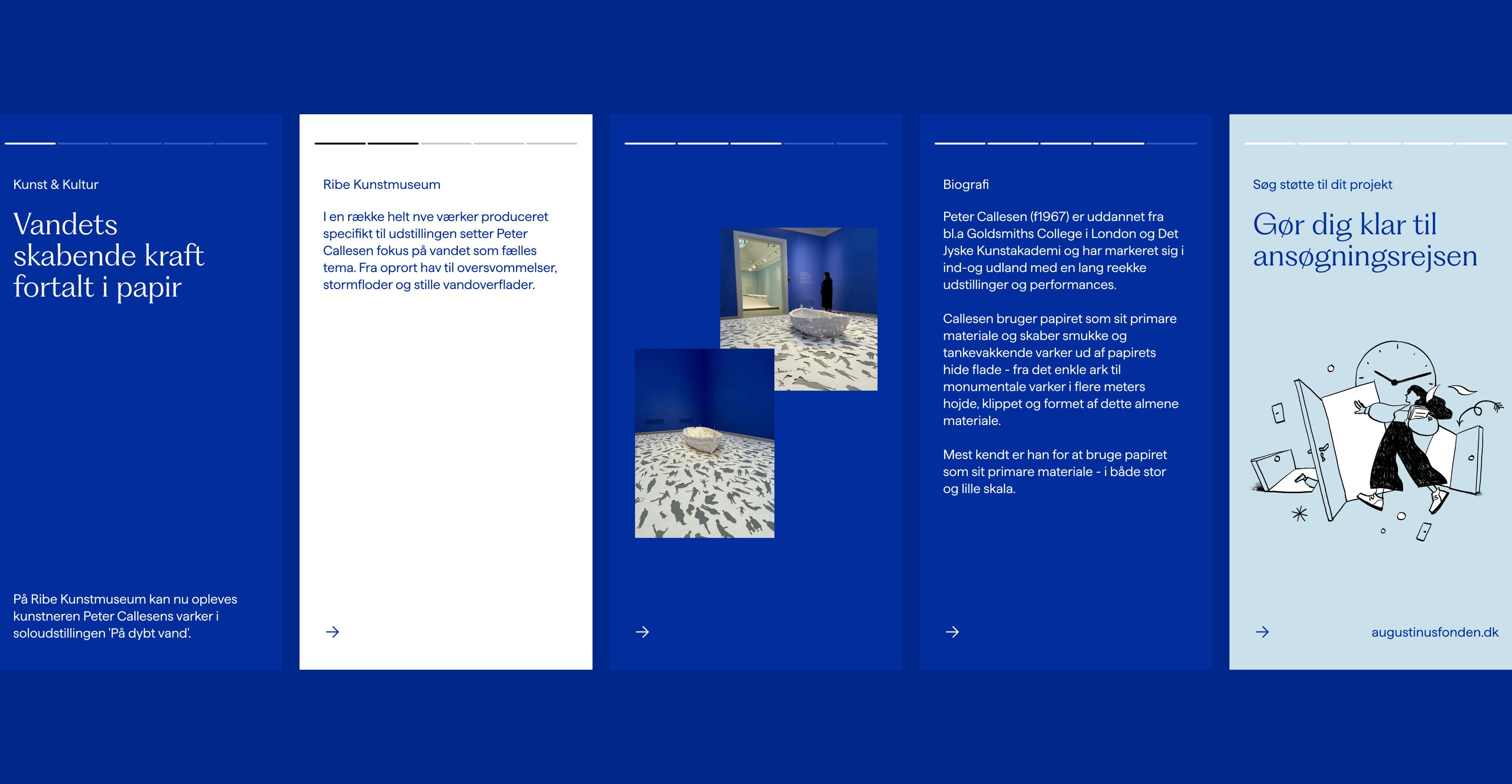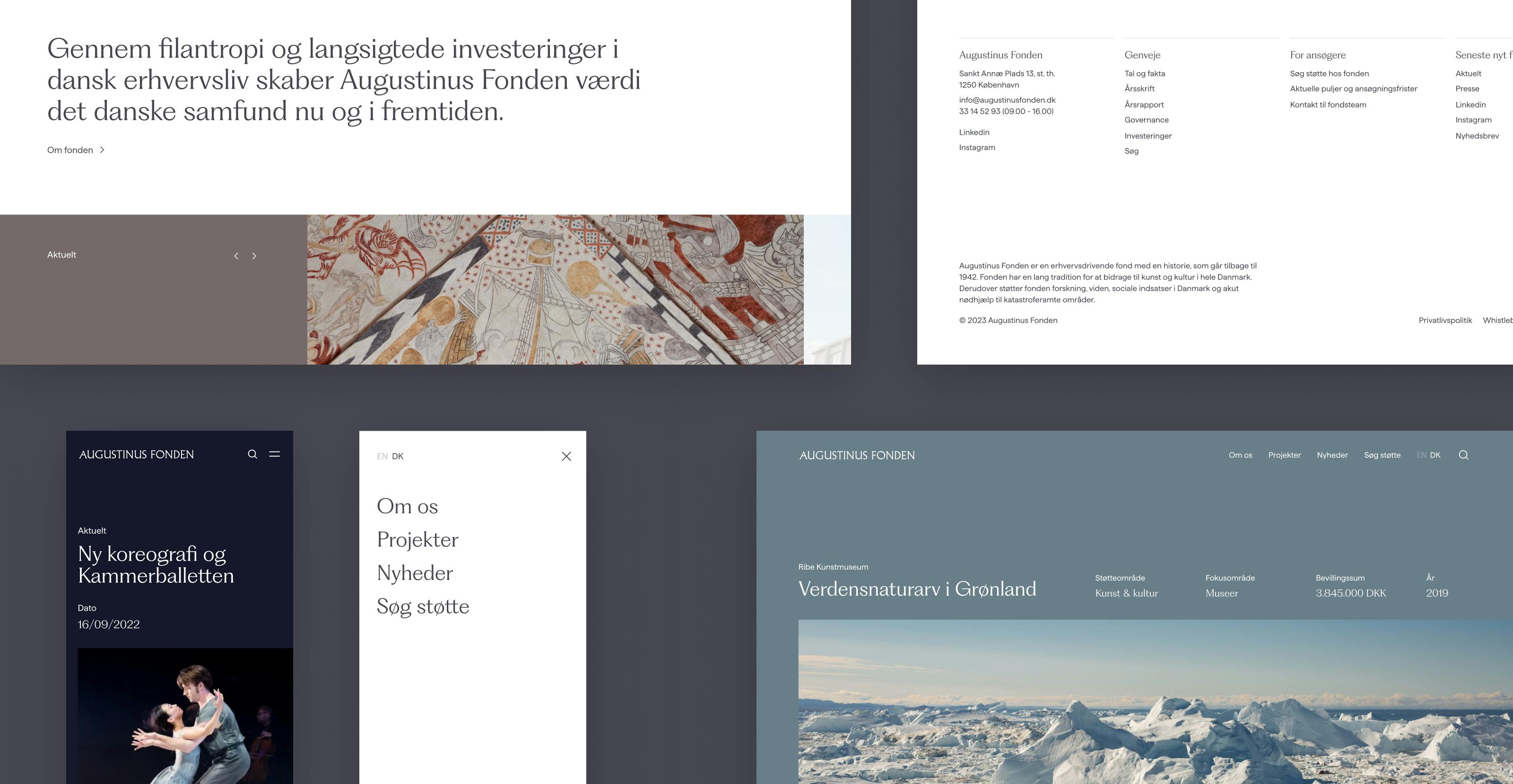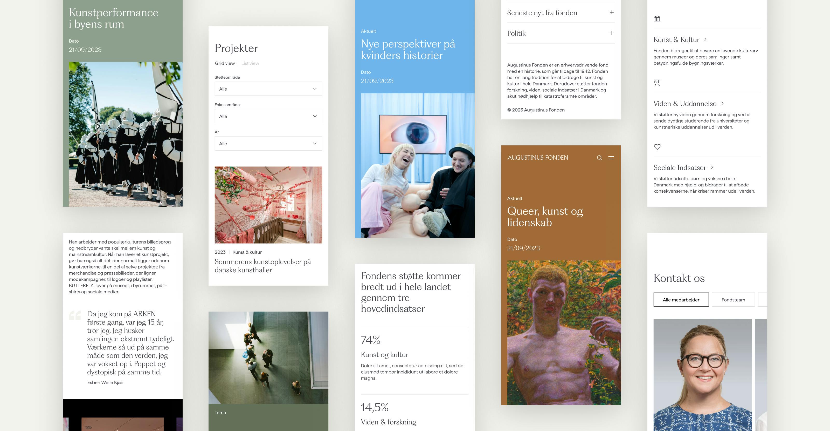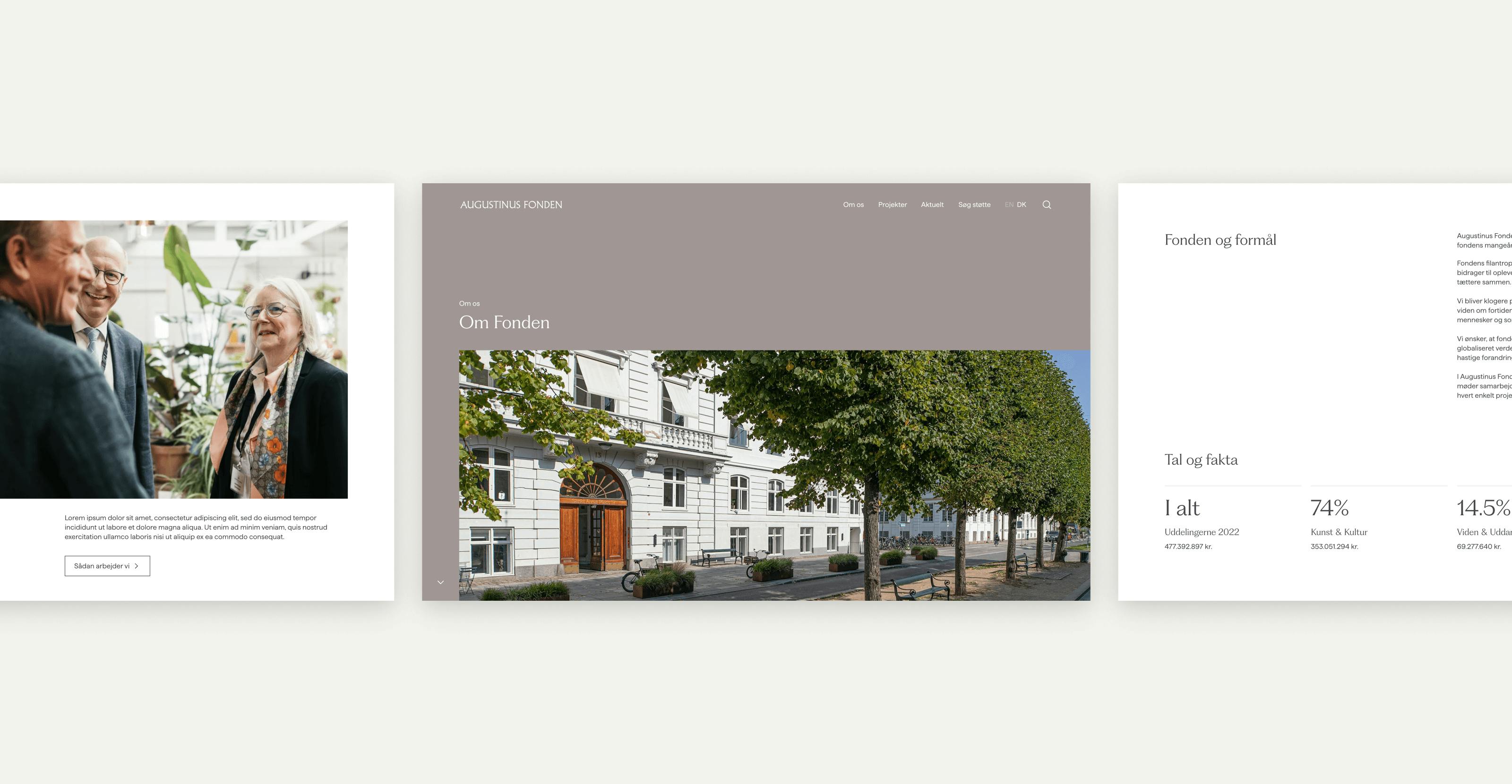 Augustinus Fondens website er den digitale indgang til fonden og byder på et univers af projekter inden for kunst, kultur, forskning og sociale indsatser. Der er skabt et digitalt univers, der imødekommer omverdens videns behov og interesse i fondens arbejde, støttemuligheder og betydning for samfundet. Fokus har været på at skabe en god brugeroplevelse baseret på best practice, der skaber den ønskede værdi for brugeren, og samtidig sikrer, at ansøgere finder det indhold og den inspiration, de er på udkig efter.