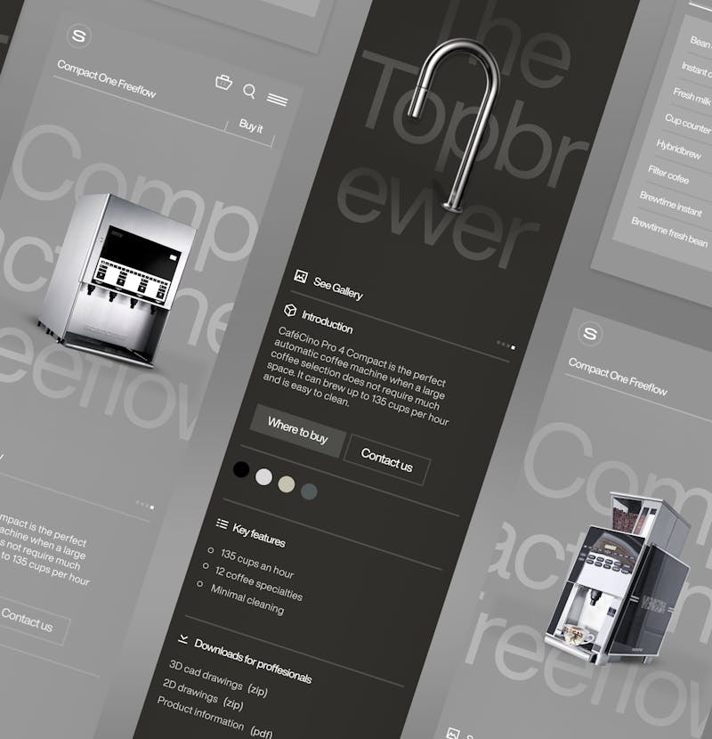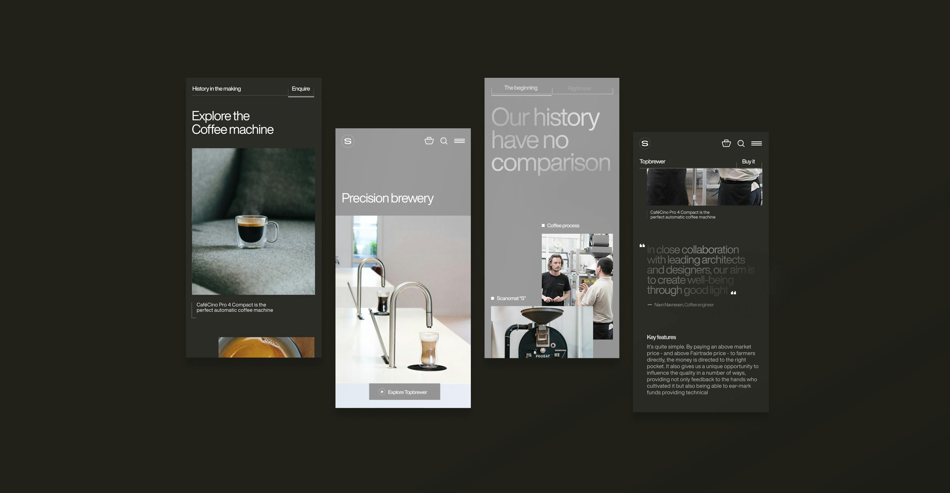 Vi ønskede at omfavne den metalliske fornemmelse, som kaffemaskinerne bærer – at efterligne det faktiske produkt, der møder slutbrugeren. Ved at bruge små grafiske elementer, gitre og store billeder skabte vi et look, der viste Scanomats produkter ganske teknisk, men med en antydning af en redaktionel livsstil fra den nordiske tradition.
