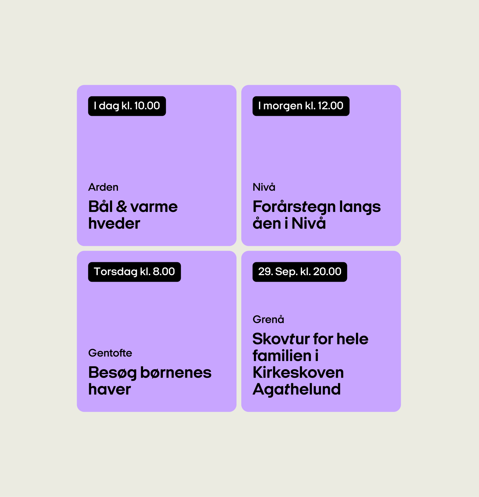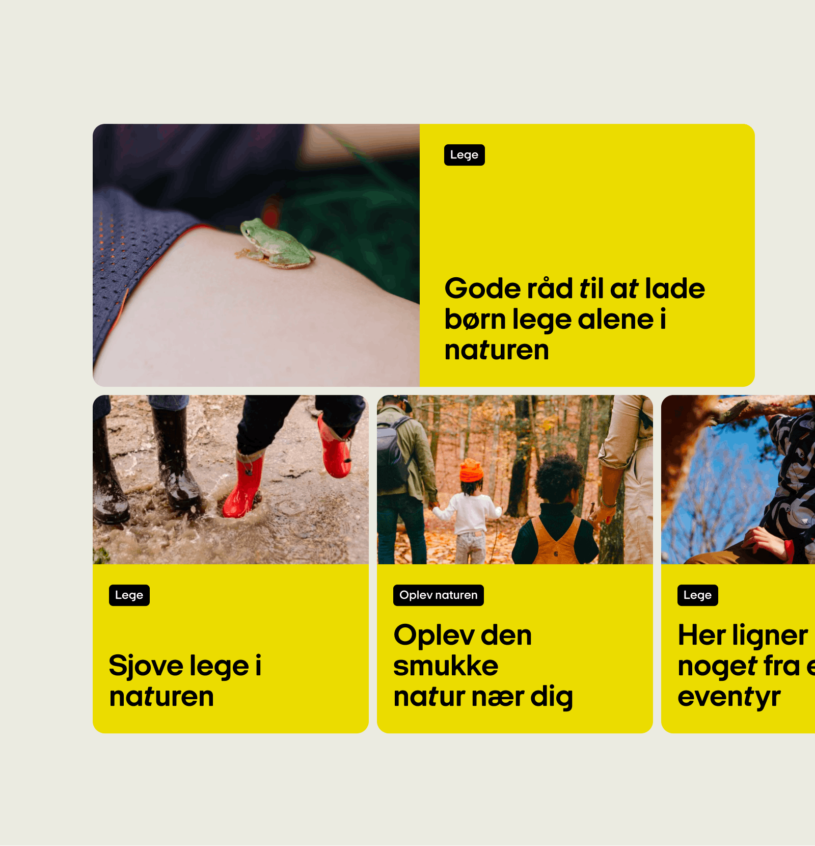 Med udgangspunkt i CVI fra e-Types er der skabt et design, som har fokus på en simpel, tydelig og legende invitation til både forældre og potentielle frivillige om at tage børn med ud på eventyr i naturen. Ambitionen var at fjerne så mange barriere som muligt i det travle familieliv, så det var nemt at bringe naturen ind i hverdagen, weekenden og ferierne.