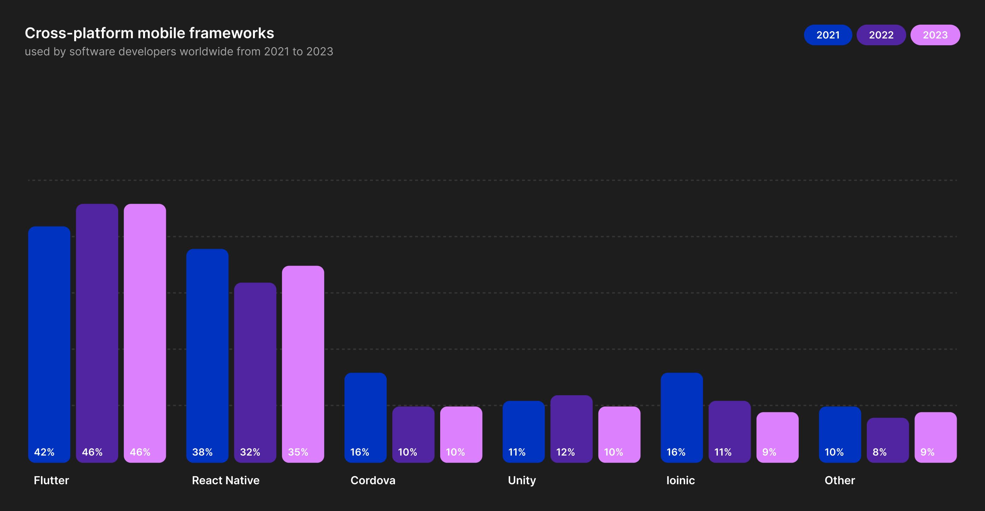 Since its release in 2017, Flutter has seen tremendous growth. Over one million apps have been published using this framework, thanks to its strong developer community and scalable capabilities. With such a strong foundation, Flutter is a highly effective option for your next project. Over the last years, we have seen larger companies developing their apps using the Framer tool, such as Monta and Airbnb.